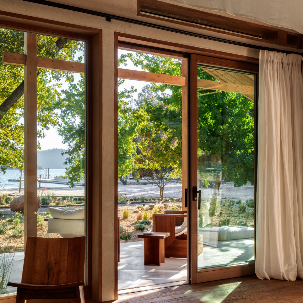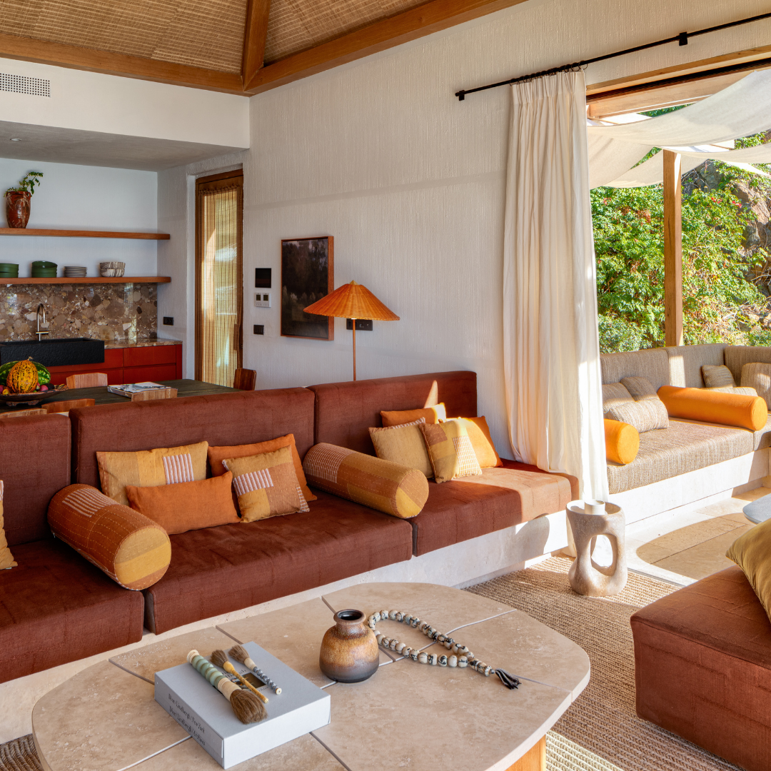 30 m², offene Raumstruktur, natürliche Materialien, helle Steinböden, Leinenstoffe in sanften Tönen, große Fenster mit Blick in den Garten, Holzakzente, schattige Terrasse mit Sitzbereich, stilles Ambiente für Rückzug und Leichtigkeit