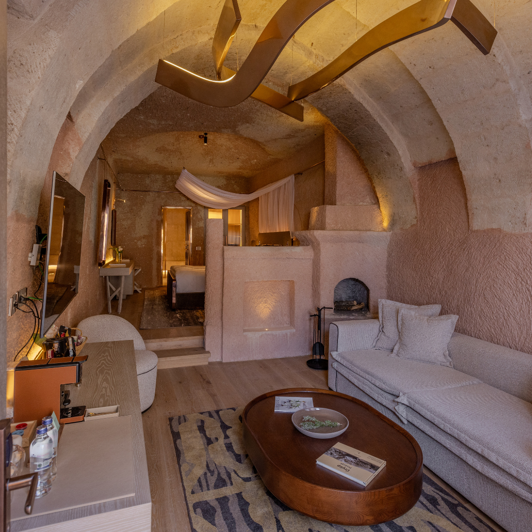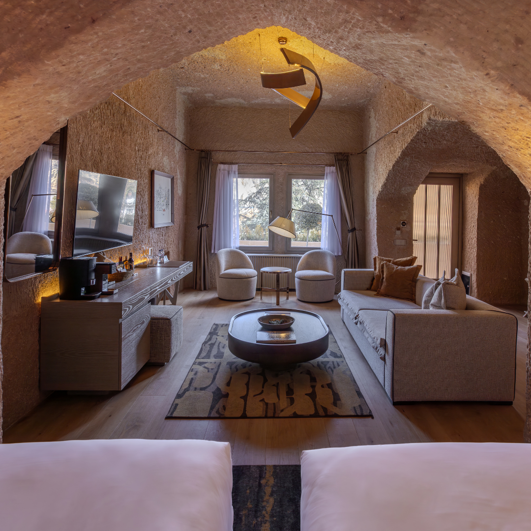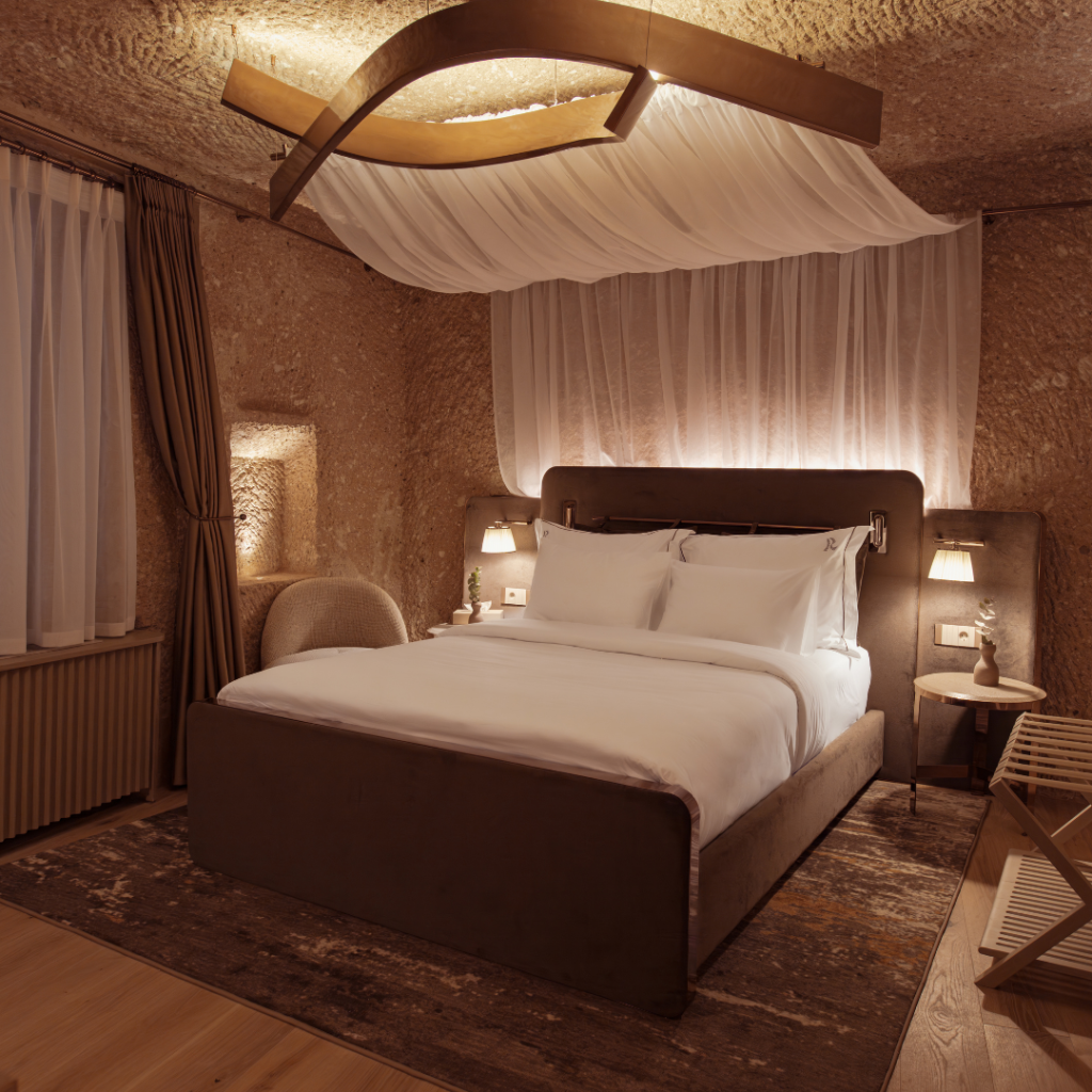 Die Zimmer und Suiten verbinden die charakteristische Höhlenarchitektur Kappadokiens mit zeitgenössischem Design. Jedes Detail ist auf Ruhe und Ausgewogenheit abgestimmt – weiche Formen, sanftes Licht, klare Linien und eine Atmosphäre, die zum Innehalten einlädt.