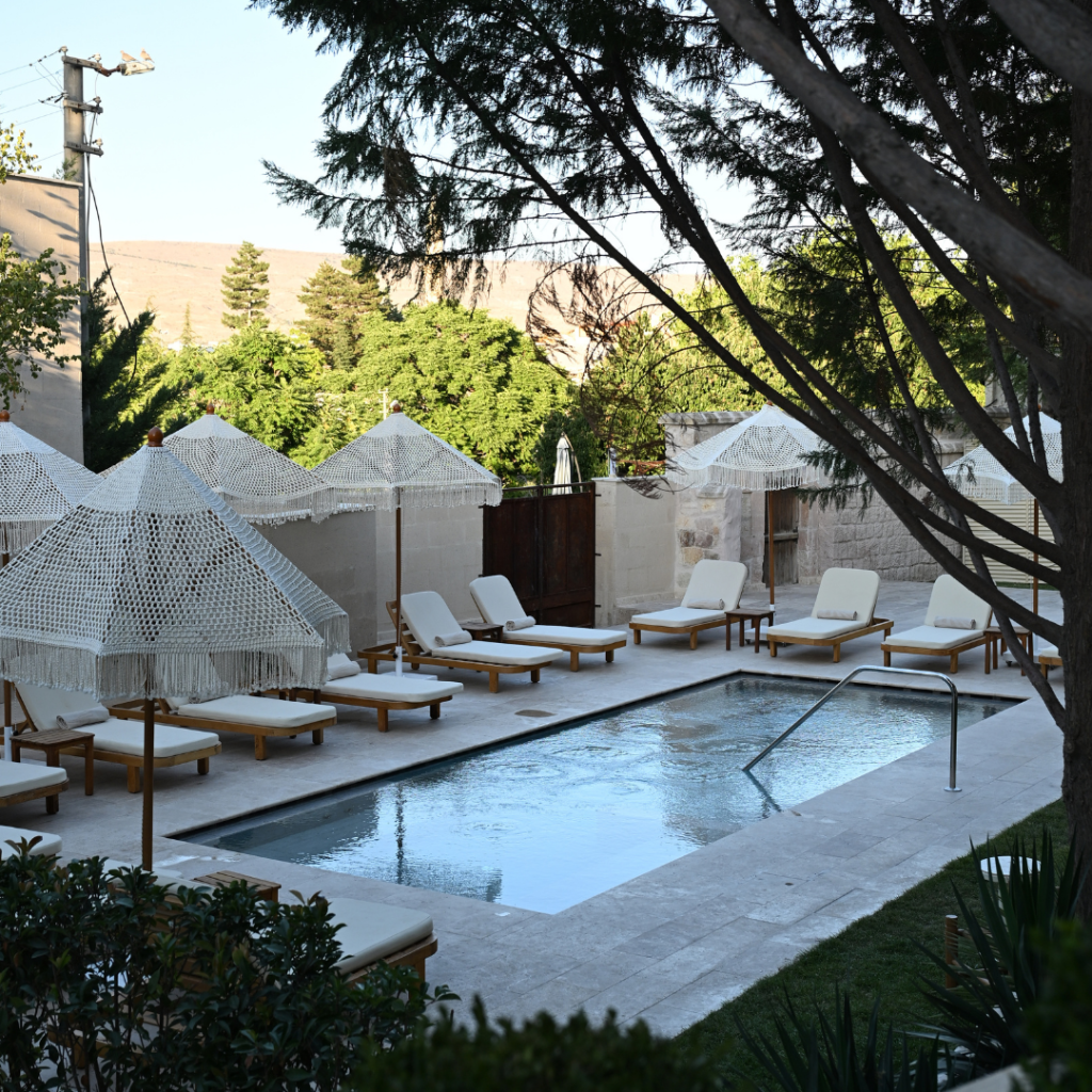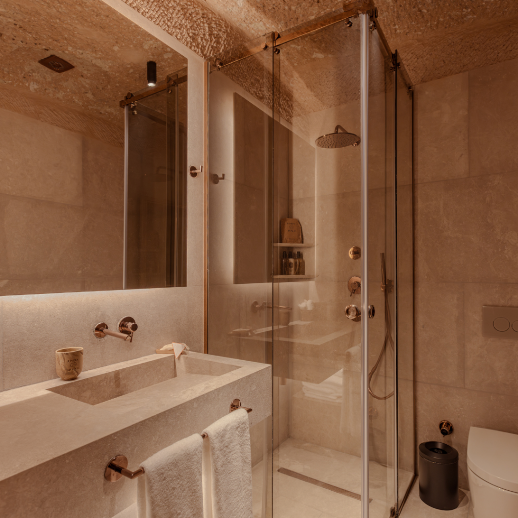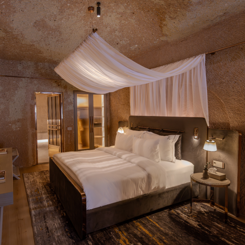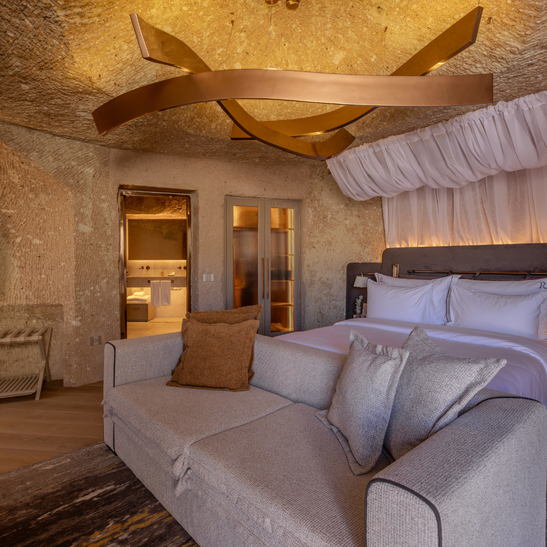 Die Zimmer und Suiten verbinden die charakteristische Höhlenarchitektur Kappadokiens mit zeitgenössischem Design. Jedes Detail ist auf Ruhe und Ausgewogenheit abgestimmt – weiche Formen, sanftes Licht, klare Linien und eine Atmosphäre, die zum Innehalten einlädt.