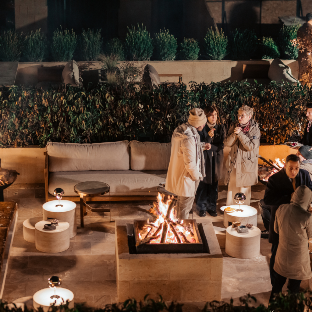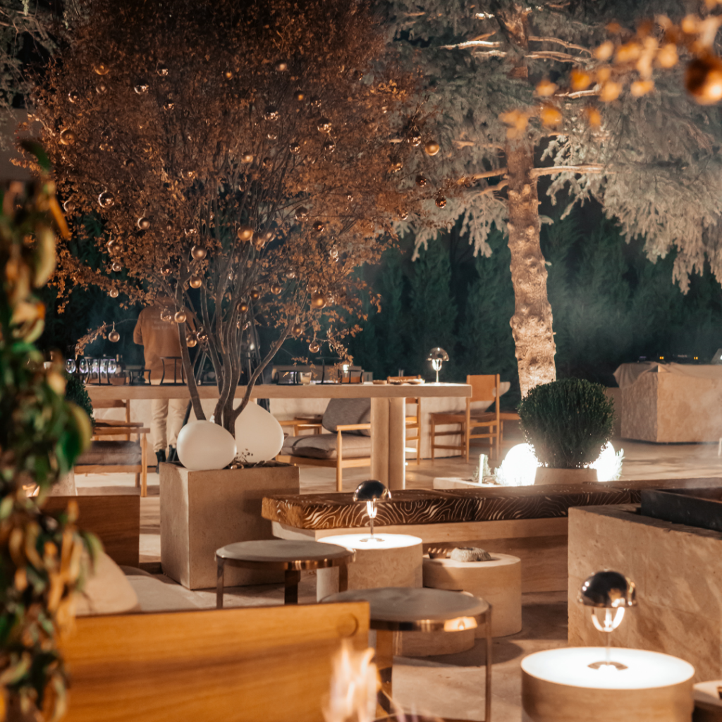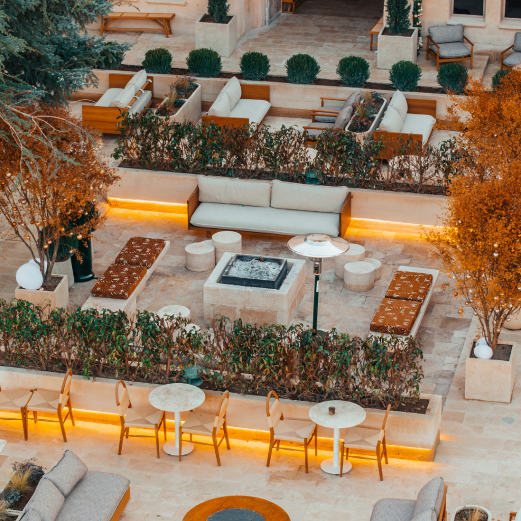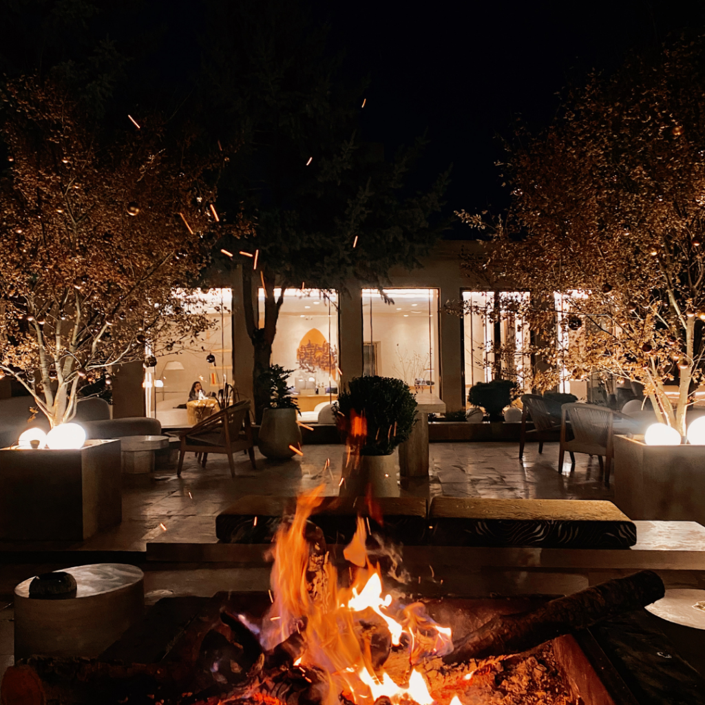 Bei Einbruch der Dämmerung erstrahlt der Innenhof in sanftem Licht. Ein Platz am Feuer in der Courtyard Bar & Lounge, ein Glas Wein und der Blick auf die stillen Täler – ein Moment, der den Zauber dieser Landschaft einfängt.
