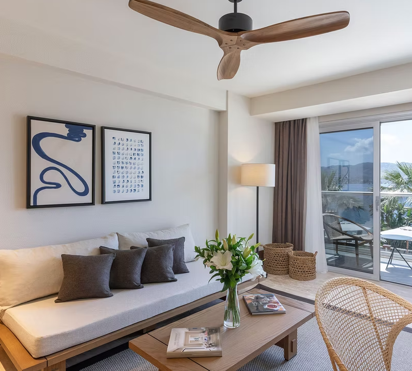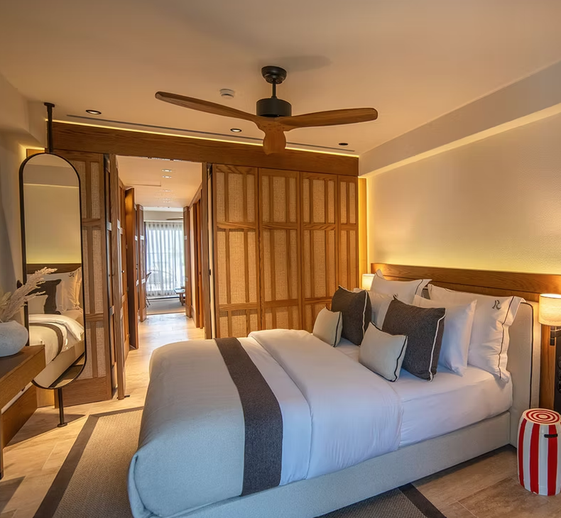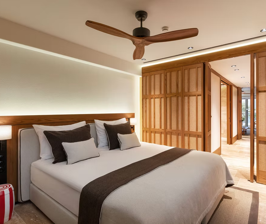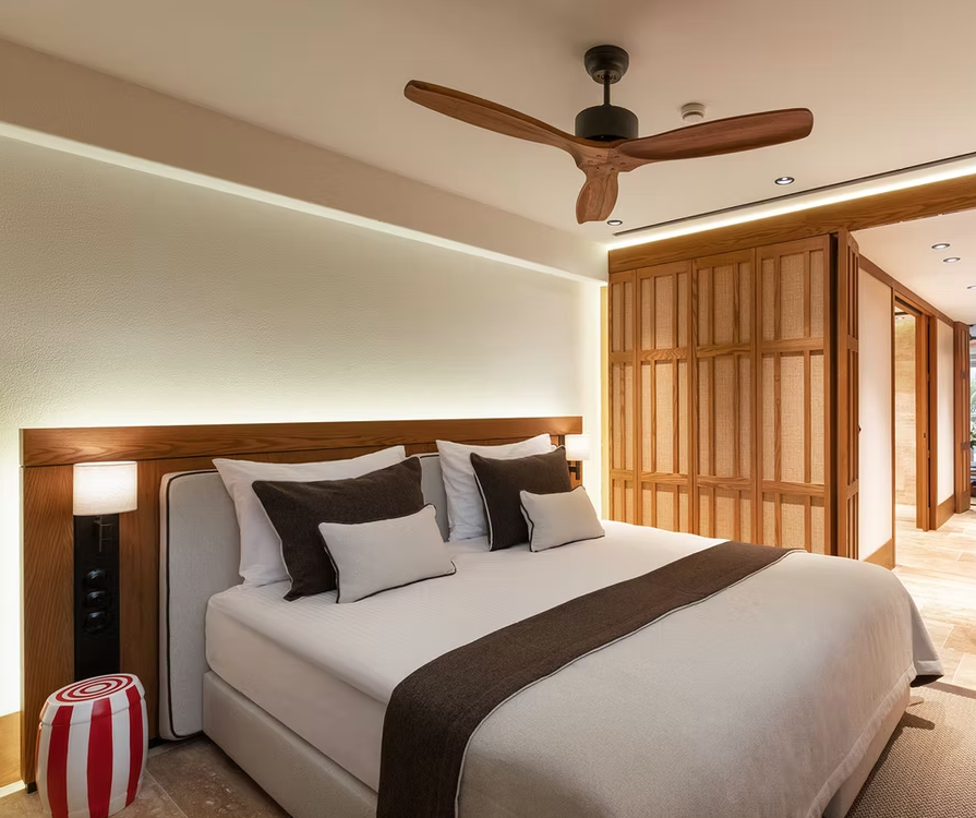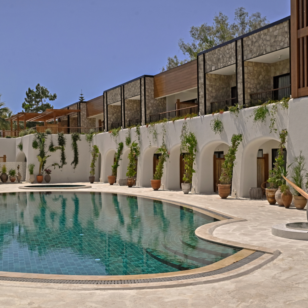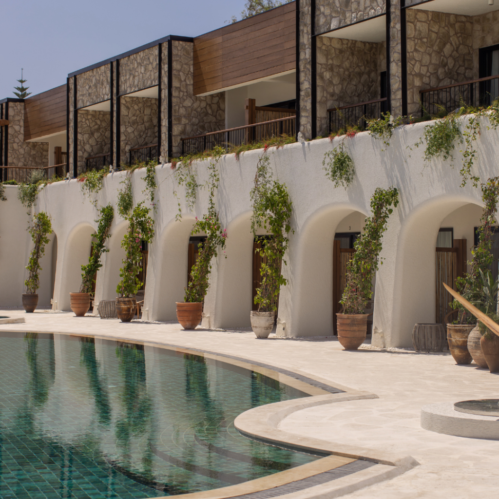 Alle Unterkünfte sind reduziert gestaltet – mit edlen Stoffen, klaren Linien und sanften Farben, die das natürliche Licht der Ägäis einfangen.