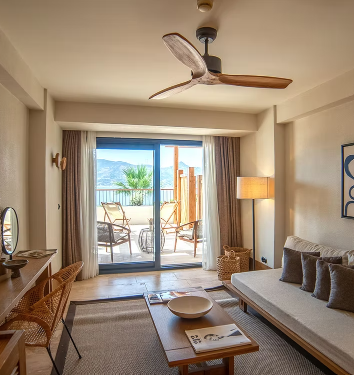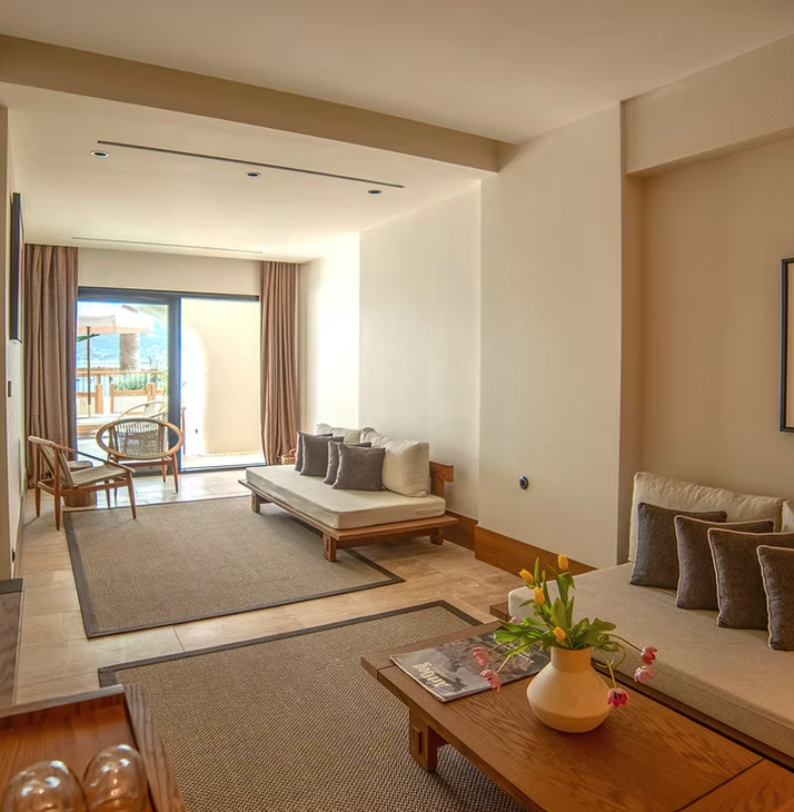 50 m², Blick auf die Yalıkavak Marina, Kingsize-Bett, separater Wohnbereich, bodentiefe Fenster, Terrasse mit Lounge-Bereich, elegantes Bad mit Regendusche und Pflegeprodukten, Smart-TV, WLAN, Kaffeemaschine, Minibar, Klimaanlage, Safe, Schreibtisch