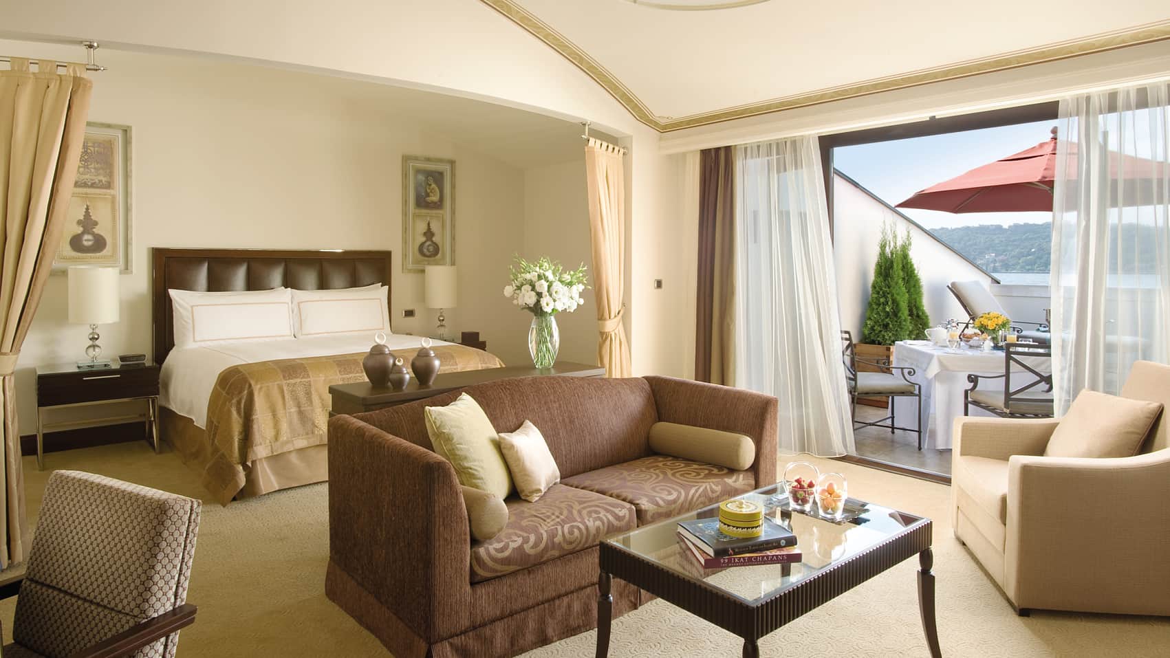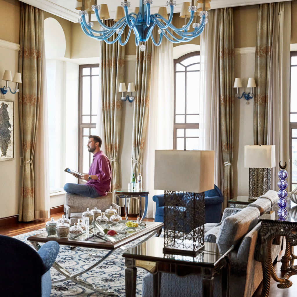 65 m², auf der obersten Etage des Palastes, mit privater Dachterrasse und atemberaubendem Panorama über den Bosporus, die Altstadt und das asiatische Ufer. Ein separates Wohnzimmer, elegante Farbwelten in tiefem Blau und Kupfer sowie ein edles Marmorbadezimmer formen eine Suite von seltener Schönheit