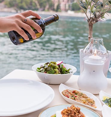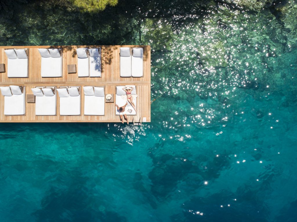 Lassen Sie sich bei Sonnenuntergang mit dem Boot zum Serenity Beach bringen – ein versteckter Ort, nur über das Wasser erreichbar. Während das Licht golden über der Bucht schimmert, serviert das Team ein Glas Rosé und kleine mediterrane Häppchen direkt am Steg – still, privat und vollkommen.